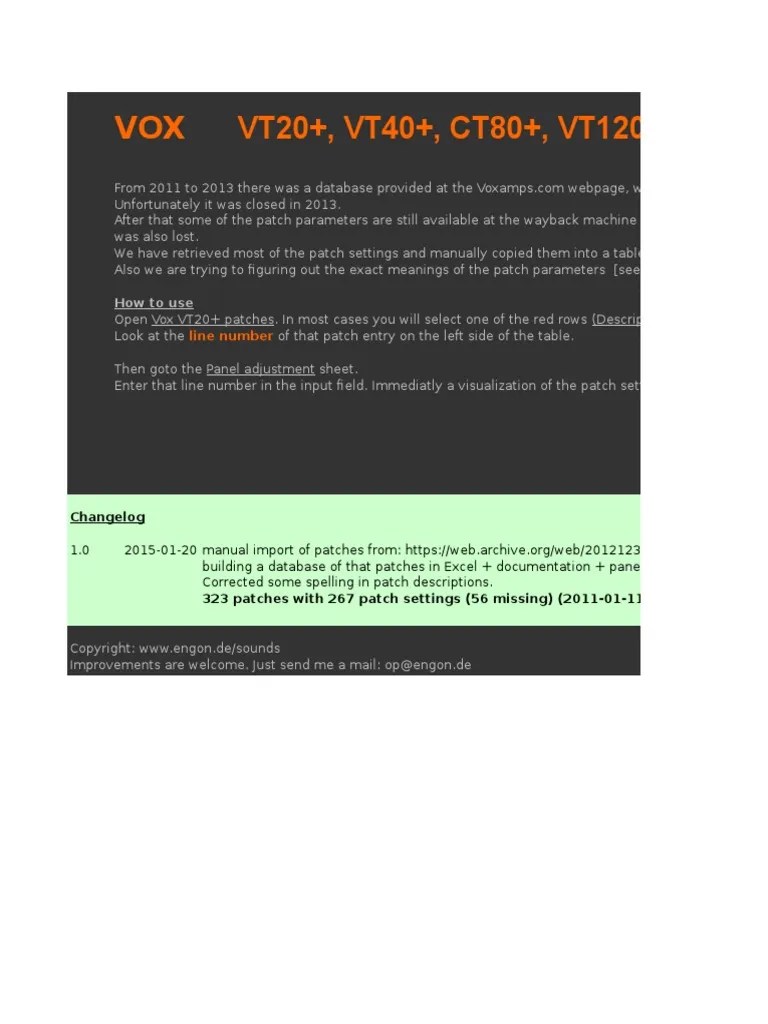 Forgot to add i used the amp only in manual mode & added my own . Por favor, lea este manual para entender las . Product, manual, package or battery along with. The online resource for vox owner's manuals. User manual for the device vox vt20+.